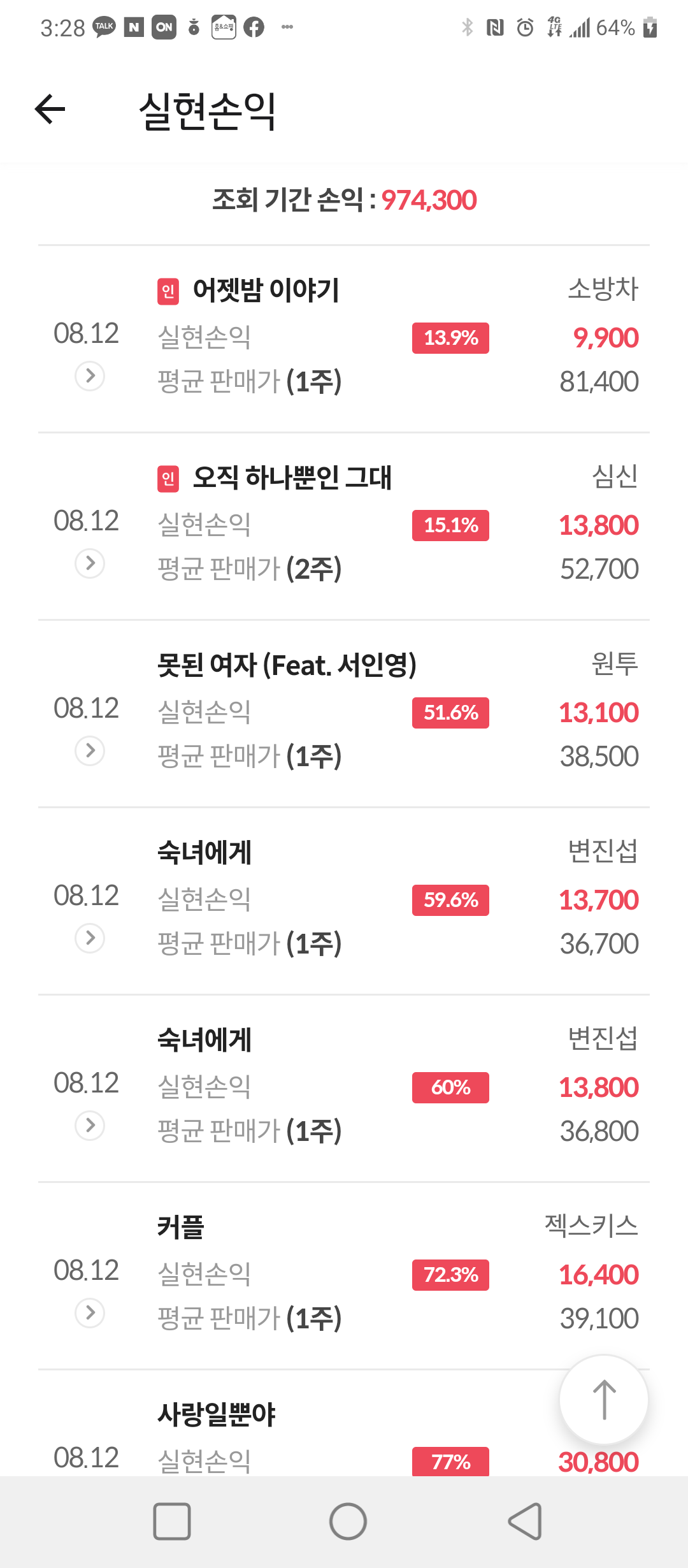 저도 어느 정도 수익을 봤을때 매도하는게 적당한가에 대해서는 아직 확신을 못가지고 있지만 판매 수수료가 곡당 300원 정도이니 1만원의 수익을 보고 판매한다고 생각하면 3%의 적지 않은 수수료를 내야하니 이점을 적당히 고려해서 전략을 짜야할것 같습니다.