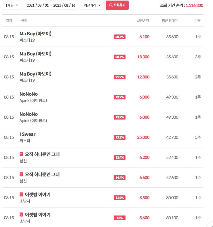 광복절 연휴 기간 제가 갖고 있던 노래들 중 10% 이상 이익을 실현한 저작권에 대해 이익을 실현했습니다. 더 가지고 있는다면 더 많이 오른 가격에 팔 수도 있고 저작권료 수익까지 볼 수 있지만 10%가 넘는 고수익을 이룬 결과를 이익실현 하지 않는다면 나중에 후회할 수 있을것 같아 정리하였습니다.