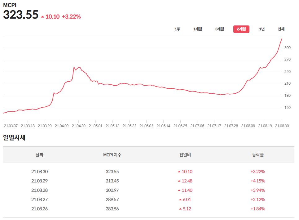 보시는것과 같이 MCPI지수는 연일 상승 상승 상승하고 있습니다.